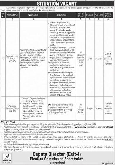 Candidates, if you are seeking Election Commission of Pakistan Jobs 2025, Apply Online yes. Then it would help if you tried to complete the Election Commission of Pakistan Jobs because here you can easily apply for these vacancies: Deputy Director (G&S) (BS-18), and Assistant Director (G& SI) (BS-17).