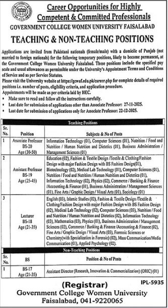Both Male and Female candidates can apply for these Government College Jobs 2025 who have the Qualification: English (03), Islamic Studies (02), Fashion & Textile Design/Textile & Clothing/Fashion Design with major Fashion Design with BS Fashion Design (02), Medical Lab Technology (02), Computer Sciences (03), Nutrition/Food and Nutrition/Human Nutrition and Dietetics (02), Information Technology (03), Mathematics (03), Physics (01), Business Administration/Management Sciences (02), Commerce/Banking & Finance /Accounting & Finance (02), Fine Arts/Graphic Design/Visual Arts (03), Forensic Sciences or Chemistry (with Specialization in Forensic) (02), Mass Communication/Media Communication (01), Applied Psychology (02)., and many more experienced candidates should apply before 27 November 2025.