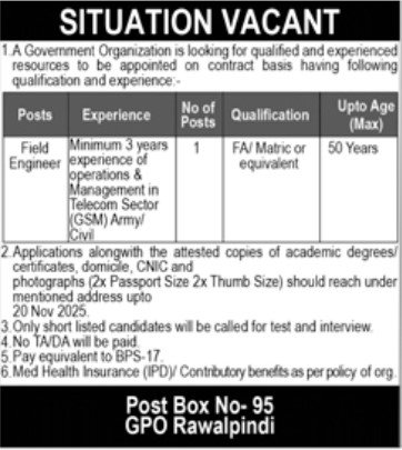 Candidates, if you are seeking Government Organization Jobs Vacancy 2025 in Rawalpindi, yes. Then it would help if you tried to complete these Government Organization Jobs because here you can easily apply for this vacancy: Field Engineer.