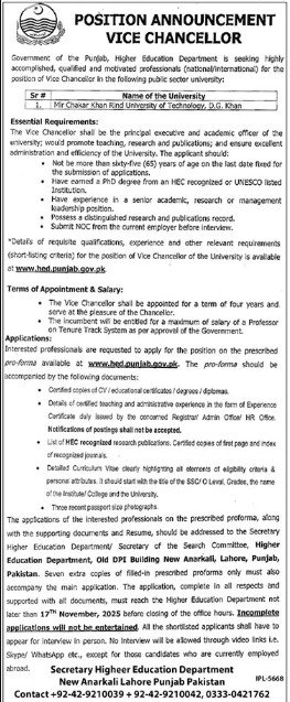 Candidates if you are seekingHigheer Education Department Jobs In Lahore In November 2025 if yes. It would be best if you tried to complete reading Higheer Education Department job because you can easily apply for these vacancies Mir Chakar Khan Rind University of Technology, D.G. Khan.