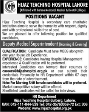 Candidates, if you are seeking Hijaz Teaching Hospital Jobs 2025 Online Application, yes. Then it would help if you tried to complete the Hijaz Teaching Hospital Jobs because here you can easily apply for this vacancy: Deputy Medical Superintendent.