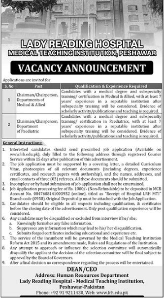 Candidates, if you are seeking Lady Reading Hospital Jobs 2025 Online Application yes. Then it would help if you tried to complete the Lady Reading Hospital Jobs because here you can easily apply for these vacancies: Chairman/Chairperson, Departments of Medical & Allied, Chairman/Chairperson, and Department of Paediatric.
