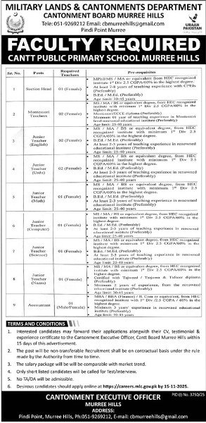 Both Male and Female candidates can apply for these Cantonments Department Jobs 2025 who have the Qualification: Div 2.5 MSMA/ DS or equivalent degree, frue HEC recognized inuitate with a minimum 1 CGPA 0% in the highest degree, B.Ed./M.B6 (Preferably), with at least 7:3 years of teaching experience in a renowned educational institution (Preferably), Age limit 25-10 years, MS MA or equivalent degrees, from HEC recognized dine with a minimum 1 Div 25 COPA in the highest degree., BEA/ME4 (Preferably), At 2-3 years of teaching experience in a renowned educational institute (Preferably), Age limit: 25-40 years, and many more experienced candidates should apply before 15 November 2025.