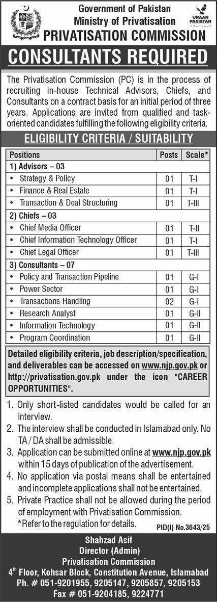 Candidates if you are seeking Ministry of Privatisation Jobs in November 2025 In Islamabad yes. then it would help if you tried to complete this Ministry of Privatisation Jobs because here you can easily apply for these vacancies: Strategy & Policy, Finance & Real Estate, Transaction & Deal Structuring Chiefs-03 Chief Media Officer Chief Information Technology Officer Chief Legal Officer Consultants-07 Policy and Transaction Pipeline Power Sector Transactions Handling Research Analyst Information Technology Program Coordination.