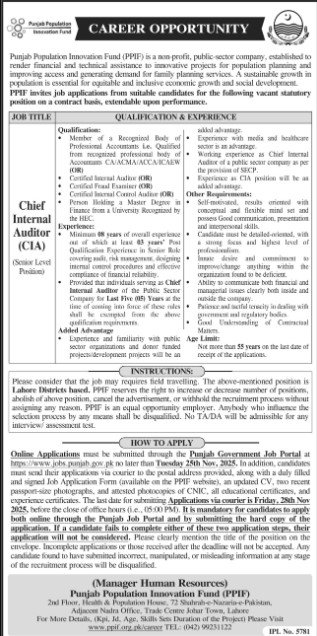 Only male candidates can apply for Punjab Population Innovation Fund Jobs In Lahore November 2025 Qualification /Experience Required: Member of a Recognized Body of Professional Accountants Le. Qualified from recognized professional body of Accouma CAMCMA/ACCAICAEW and more experienced candidates should apply before 28 November 2025.